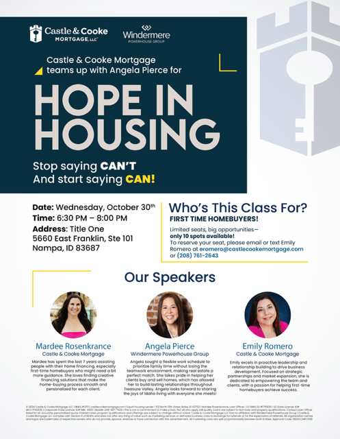 To register, email Emily at: eromero@castlecookemortgage.com